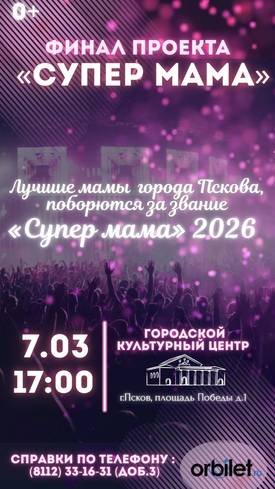 Финал проекта "Супер мама" Финал проекта «Супер мама». Впервые в городе Пскове уникальный проект, где 17 мам города Пскова поборются за звания «Супер мама» 2026. 3 месяца огромной работы! Участницы готовились к шоу-программе, а также посещали мастер-классы, учились новому и менялись как внешне, так и внутренне. Данный проект про силу, заботу и материнскую любовь, ведь мама - это та, которая может занять место всех других, но чье место не может занять никто другой. В финальной шоу-программе, так же будут выступать талантливые дети города Пскова и Санкт-Петербурга (студия танцев Аллы Духовой «Тодес» г. Псков, клуб спортивного бального танца «Диамант» г. Псков, а также детский эстрадный хор «Аврора» г. Санкт Петербург) 500-600 руб.